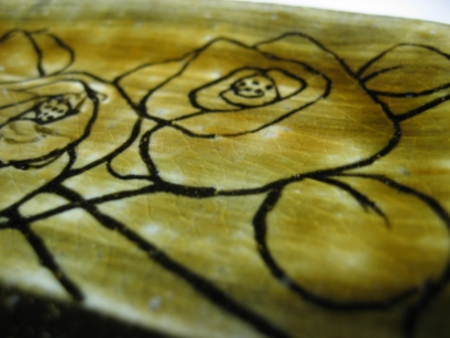 | 象嵌(ぞうがん) 線彫りした部分に違う色の土を埋め込んで紋様を描いていく技法。 |