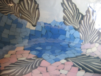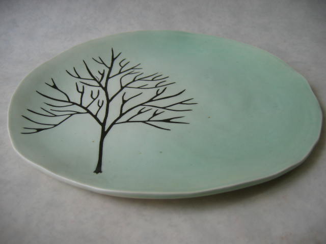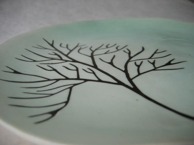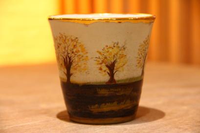 モカウェア タバコの葉などの成分に含まれる浸透拡大力を利用し酸化金属で紋様を描く技法。 自然の風景などをモチーフに描く。 |