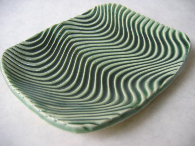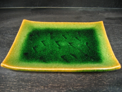 総織部 生地に灰釉と組み合わせたやわらかい緑釉を組み合わせることにより、釉溜りやグラデーションを作り見どころとする。 |
