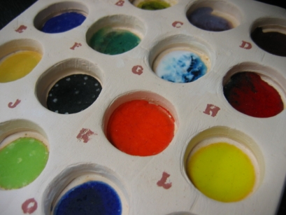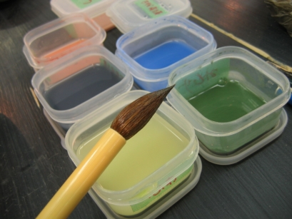 和紙染め 吸水性の高い和紙を使って絵を描いていく技法。和紙はちぎったり、切ったりして描くので絵心が無い方にも安心の技法。 ![]() |