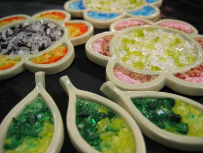 ガラスカレット(低温溶融) ガラスと生地土の縮小係数の違いと溶解温度差特性を利用した技法。 カラフルな色合いのガラス ![]() |