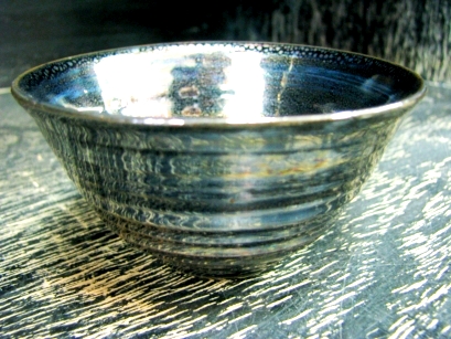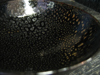 油滴天目(ゆてきてんもく) 天目釉の表面に結露したような油滴紋様を作る技法。 |