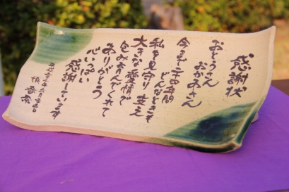 三家族仲良く、同じ茶碗で、これからもよろしく。食事をするたびに家族の絆を感じる手作り茶碗。 珍しい、豪華、直筆、の陶板の皿に書いた感謝の言葉は半永久的に家族の絆をつなぐ。 幼少のころに手をつないだ記憶が蘇る。お茶を飲むたびにお茶を飲むたびに離れていても毎日繋がる。 花束贈呈に変わる新しい親ギフトのかたち。子育てお疲れ様。これからはこの苗木を育ててね。結婚式の頃になると花が咲き思い出してもらえる。 色彩も種類も豊富。品質も確か。