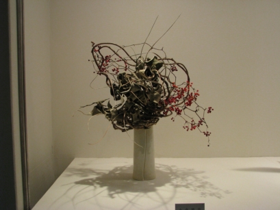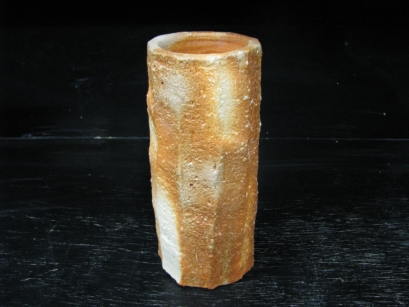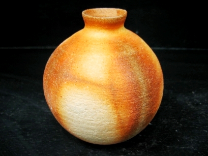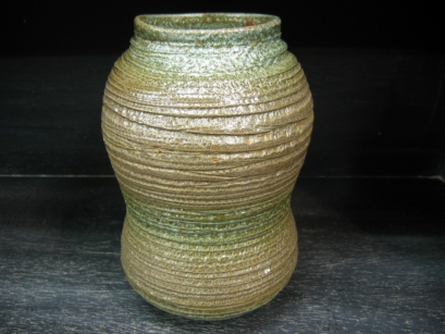 ![]() 緋襷の花入れ 上手に藁を巻きました。緋の紋様が大変綺麗です。作者はとっくりだと言っていますが、どうみても花入れですね(笑)。 |