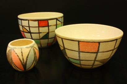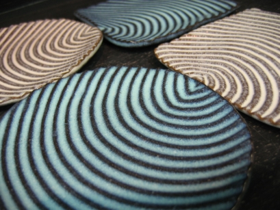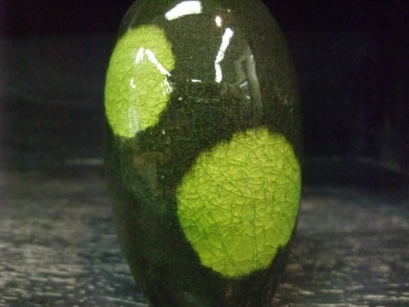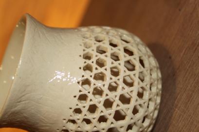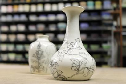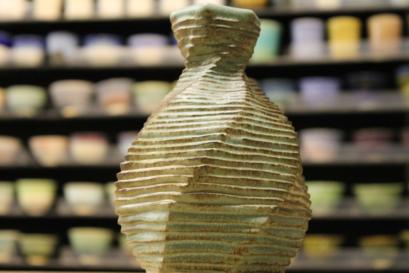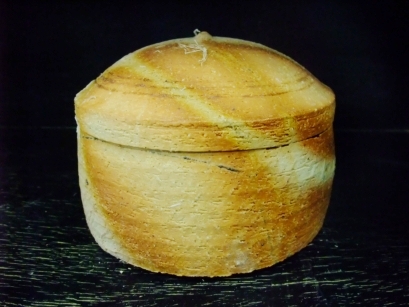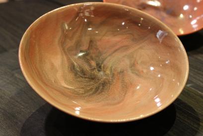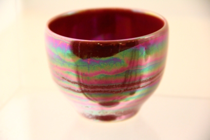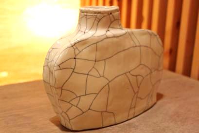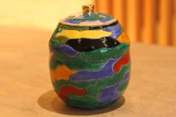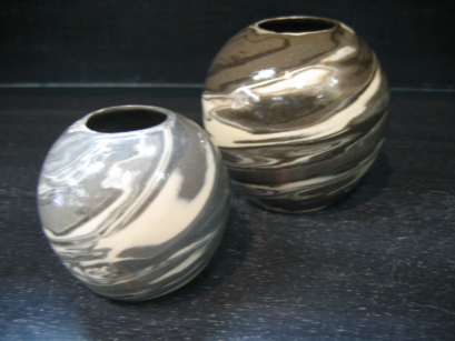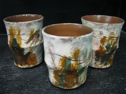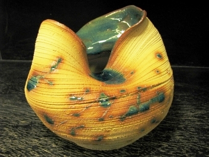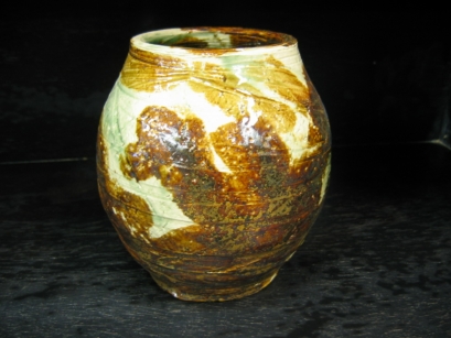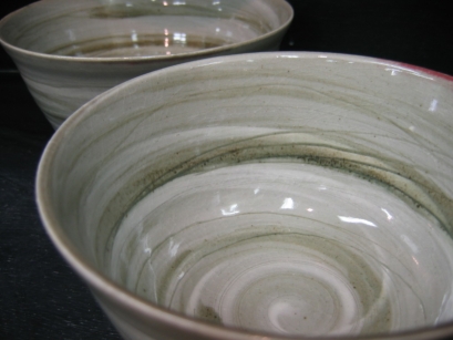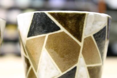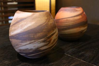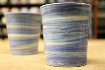 ![]() 練り込みによる装飾作品。異色の粘土を三つ練り込んで電動ろくろで素早く成形している。 |