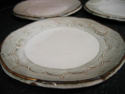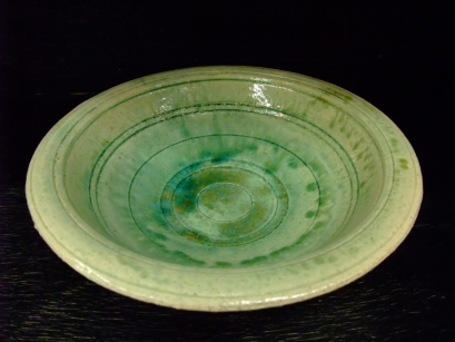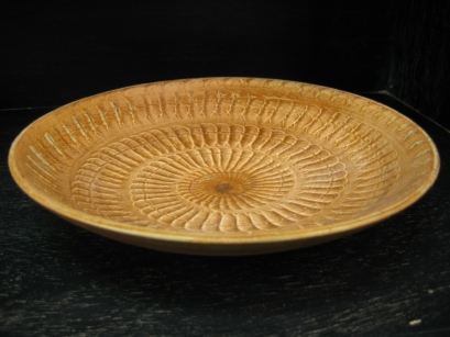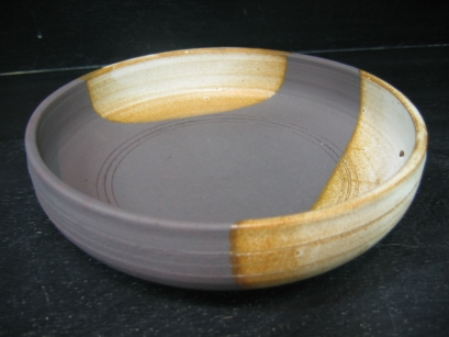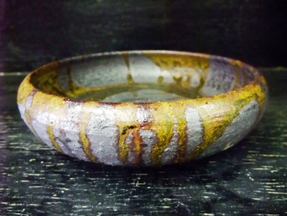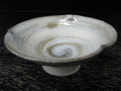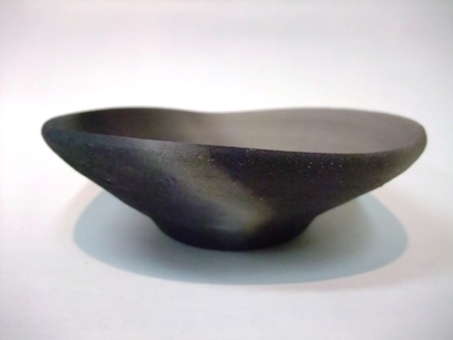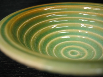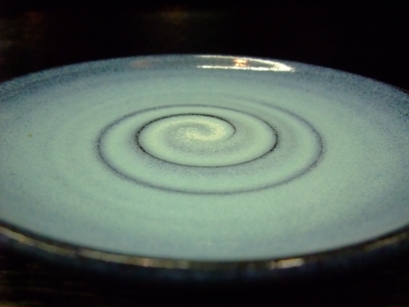 ![]() 轆轤目のお皿 電動ロクロで高く引上げた円柱を二つに割ってお皿にしています。内側の強力な轆轤目が大胆ですね。還元焼成。 |
