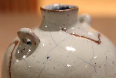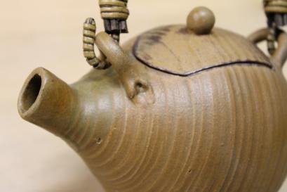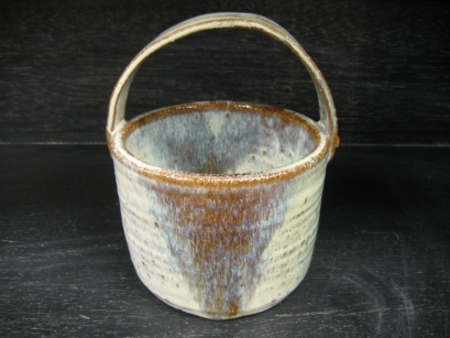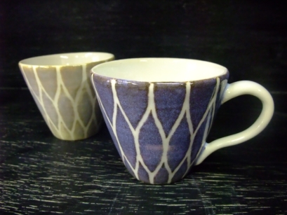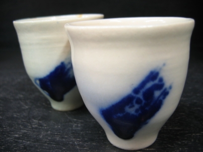 ![]() 萩の白薬にコバルト釉を掛けている。口縁に覗く赤土が雰囲気を締めていますね。特徴的なハンドルも握りたくなる逸品です。 |
