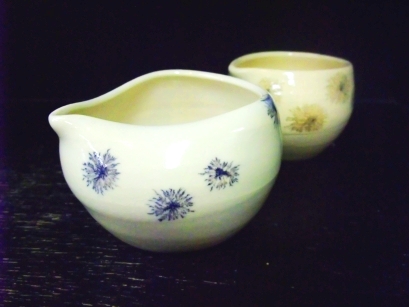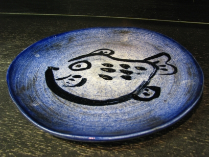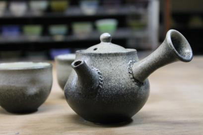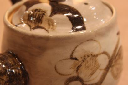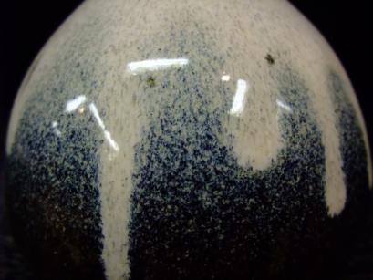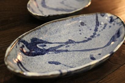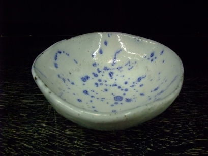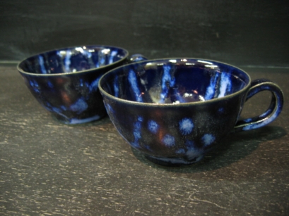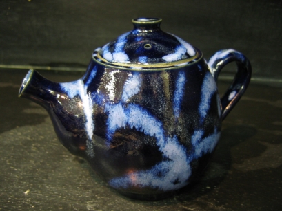 ![]() スポイト掛けのティーポット 濃紺の釉薬の上に白色釉をスポイドで掛けている。作者はこの器に合わせて湯呑も制作中です。乞うご期待。。 |