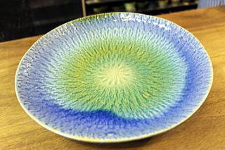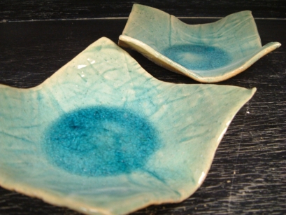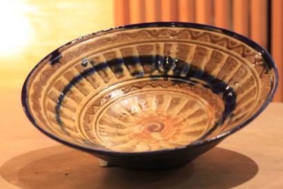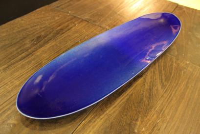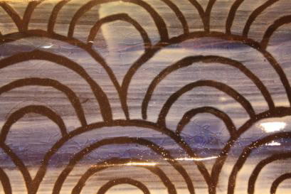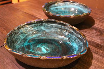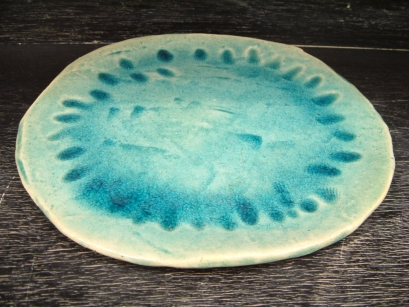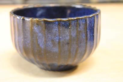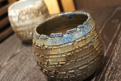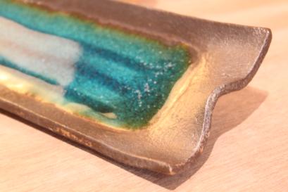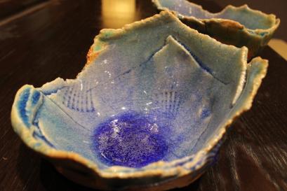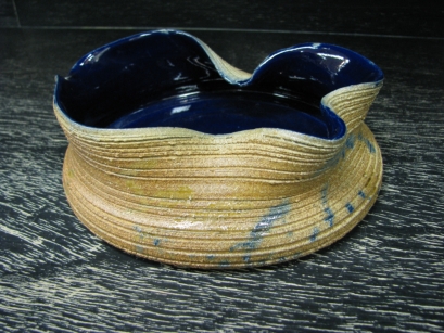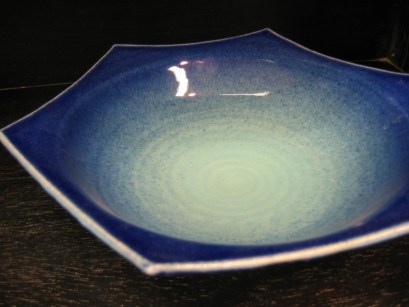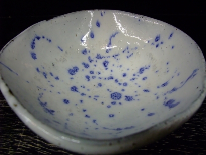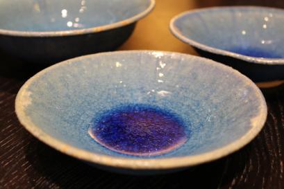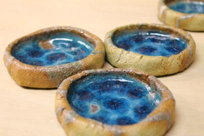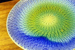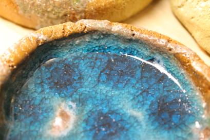 ![]() ぎやまん陶器シリーズ④ 縄紋を付けて櫛目を描いてガラス釉薬を溜めました。真っ青な湖を連想させる作品です。(レシピはメンバーズサイトで公開) |