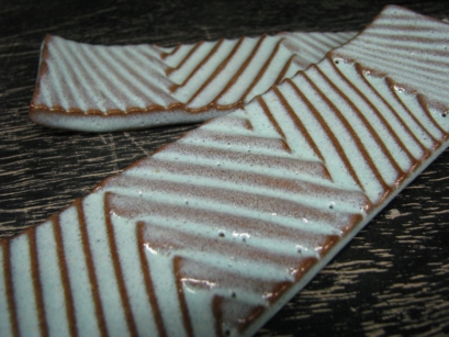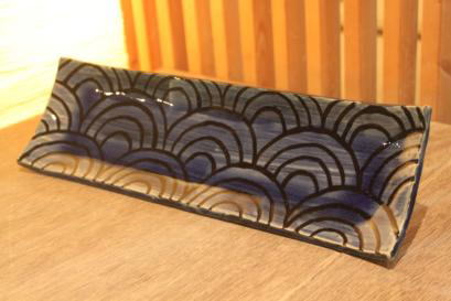![]() 掻き落としの長皿。モチーフは青海波です。大ぶりに配置した青海波と刷毛目が丁度いい風合いです。 (レシピはメンバーズサイトで 公開) |
