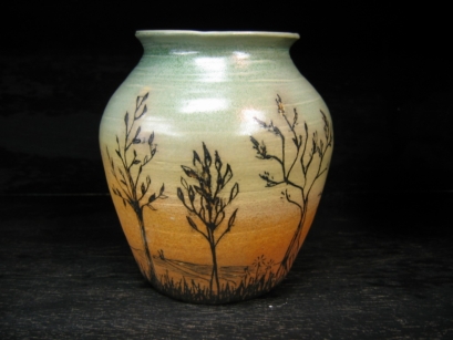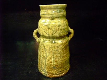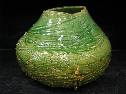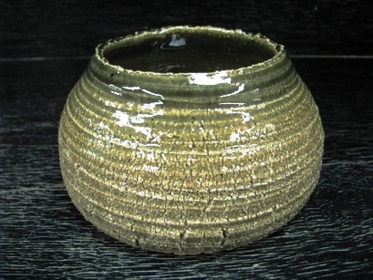![]() 還元焼成の花器 銅系の釉薬が少し赤く窯変し深みを感じさせます。豊かな膨らみと口のたわみ、表面の装飾がいいですね。(レシピはメンバーズサイトで公開) |