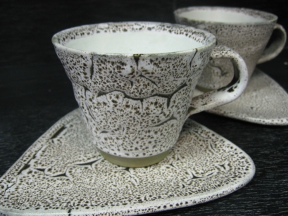 ![]() 装飾技法(釉薬)のカップソーサー 釉薬の装飾により梅花皮を作り、迫力のある釉調を作っている。(レシピはメンバーズサイトで公開) |