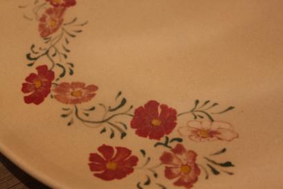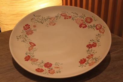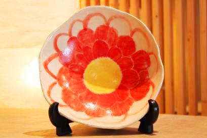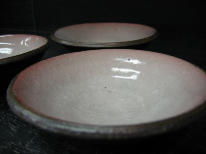![]() 志野のお皿 表面に付けた凹凸と梅花皮、緋色の土色がきれいですね。 |