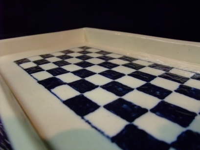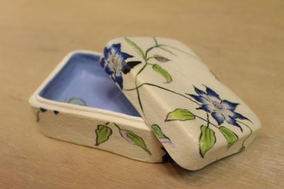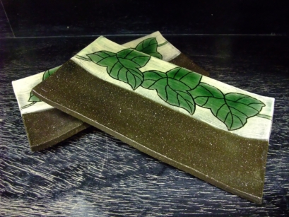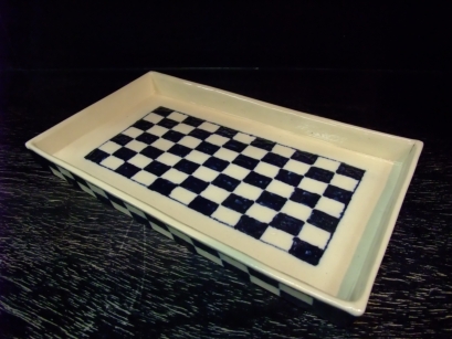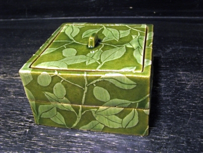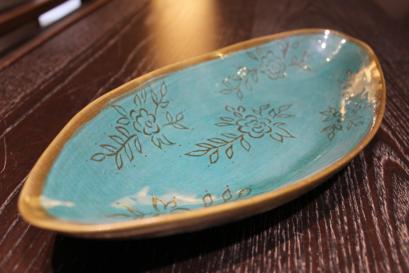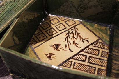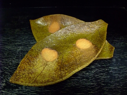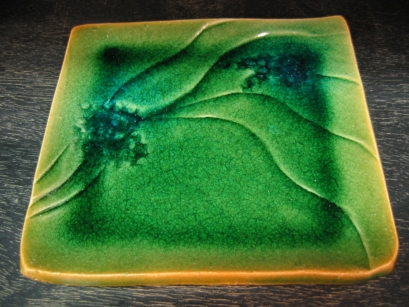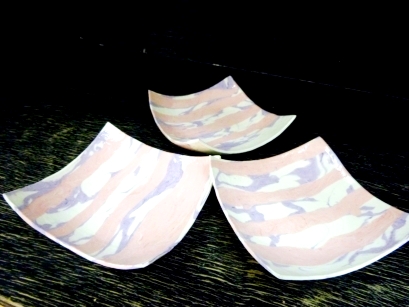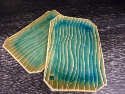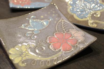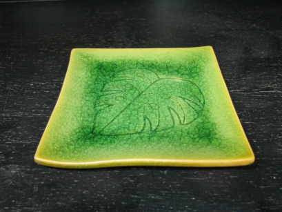 ![]() ぎやまん陶器シリーズ② 四角いお皿の中にガラス釉薬が溜まり、美しく線彫りされた葉っぱが浮かび上がっています。釉薬の量と掛け方がとっても上手くできています。きれいですね。(レシピはメンバーズサイトで公開) |