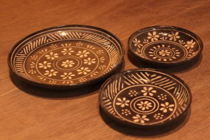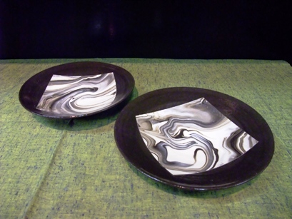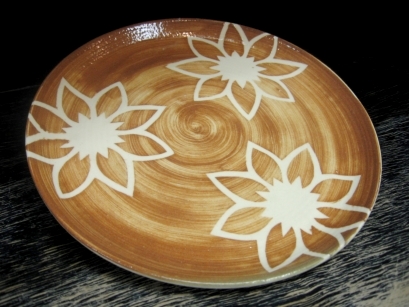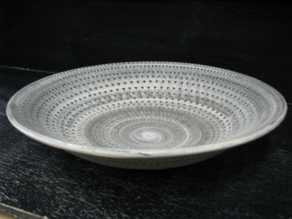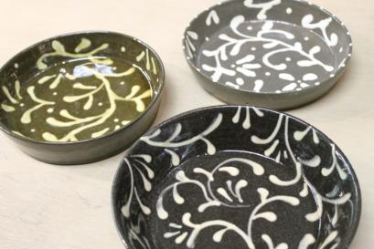 ![]() 装飾技法(打ち刷毛目)の浅鉢 螺旋状に白泥を打っている。生地土は黒。伝統的な打ち刷毛目の色彩と違って力強さ、自由さ、おおらかさ、が感じられます。 (レシピはメンバーズサイトで公開) |