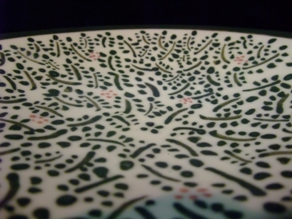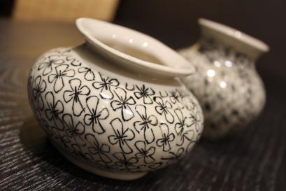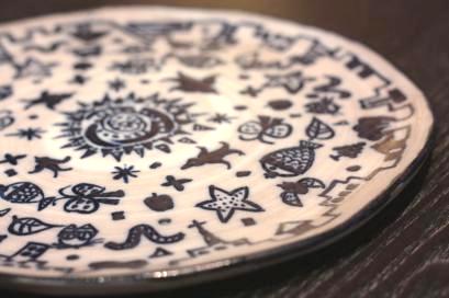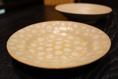 ![]() 白色釉と鉄を組み合わせて象嵌で紋様を描いた作品 それぞれの装飾が焼くという行為で一つになった感じがします。 |