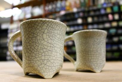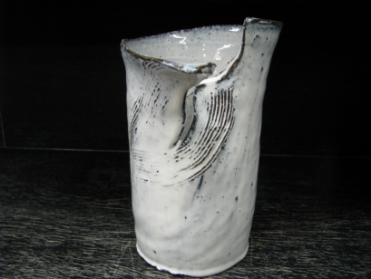 ![]() 黒い背景に白い釉薬を吹きつけることにより、粉雪のような印象になりました。ほっそりとした取っ手は女性の手でも持ちやすく使いやすい作品となりました。(レシピはメンバーズサイトで 公開) |
