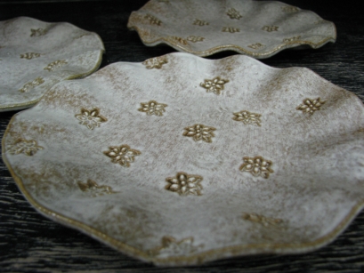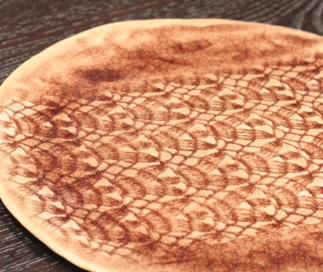 ![]() 精細な模様がきれいな平皿。転がして使うタイプの印を使用しています。タタラづくりですがろくろで挽いたように整った仕上がりです。(レシピはメンバーズサイトで 公開) |
