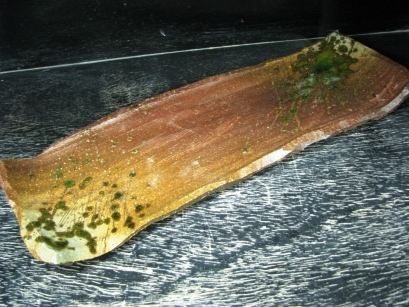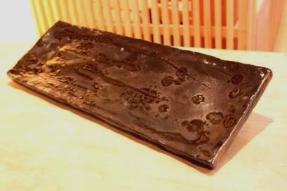 ![]() 秘境の滝と川 新緑の谷に突然現れる滝、そして滝壺から流れ出す激流、そんな景色を思わせる俎板皿ですね。でも、お寿司盛ったら流されて行きそうそうな感じですね。 大トロよイカナイデクレ~(鮭か…)川にマグロはいません。 |