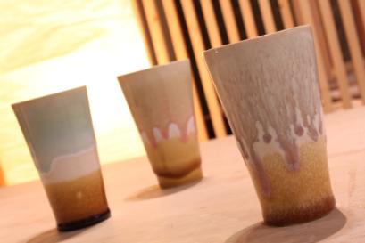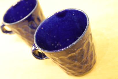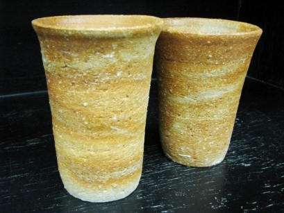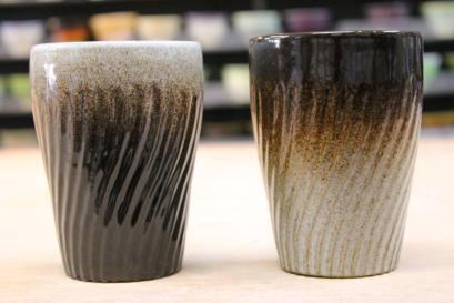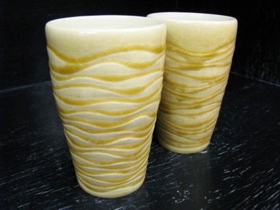 ![]() グラデーションが綺麗な対のビアカップ。鎬の曲線が見ていて心地の良いカップです。少し下に向かって細くなっており、女性の手にもなじむデザイン。作者のデザイン力が際立つ作品です。(レシピはメンバーズサイトで 公開) |