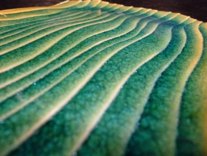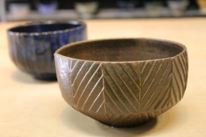 ![]() うつわの表面にかんなで装飾を入れている。かんなの跡と釉薬がよく調和して鮮やかな表情を作り出している。 |