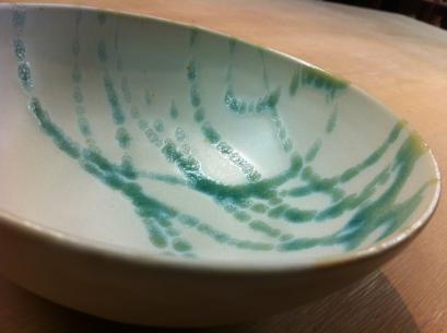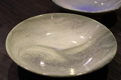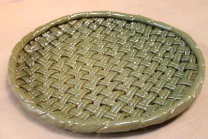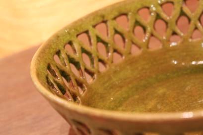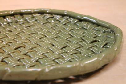 透明度が高く、濃淡がでる織部釉を掛けることにより、紐の動きがより強調されました。夏はそうめんなどをのせても美しい作品です。(レシピはメンバーズサイトで 公開) |