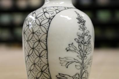 ![]() 萩釉の花器 器胎表面に付けられた装飾と釉薬が焼成により美しく調和した作品。(レシピはメンバーズサイトで公開) |