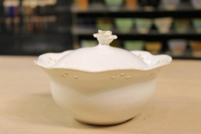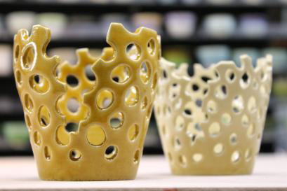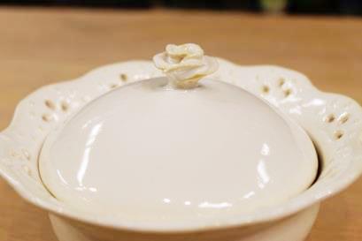 ![]() 丸いフォルムがかわいらしいキャンドル入れです。 細い花のような模様は中に明かりを入れると、とても幻想的な風景を作ります。ひとつひとつの彫りの角度が揃っていて丁寧さを感じる作品です。(レシピはメンバーズサイトで 公開) |