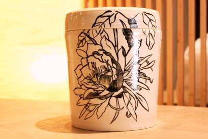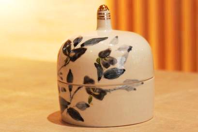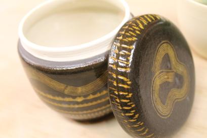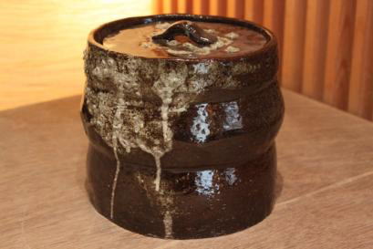 ![]() 水指(茶道具の一つ)。彩泥窯では教室問わず茶道具をつくる方は多いですが、このような大型の作品は稀。その中でもこちらの水指は特に迫力があります。(レシピはメンバーズサイトで 公開) |
