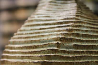 ![]() 織部の花入れ 器胎の表面装飾と施釉が美しく調和している。活けられるお花が負けそうなくらい立派ですね。(レシピはメンバーズサイトで公開) |