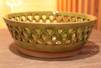 ![]() 直径30㎝ある、ザルを模した皿。細い粘土を作り、ひとすじひとすじ編み込んでゆきます。粘土の紐はヒビが入りやすいのですが水分をうまく操り制作されています。(レシピはメンバーズサイトで 公開) |