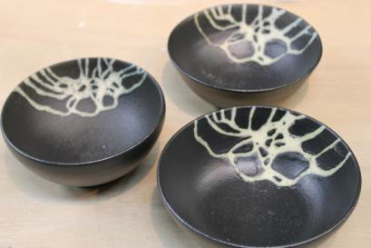 ![]() 白い模様は撥釉剤を使用し色を抜き焼き締めになっています。 黒のマットで全体に艶をなくすことで、食卓の中に溶け込む器になりました。(レシピはメンバーズサイトで 公開) |