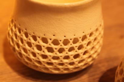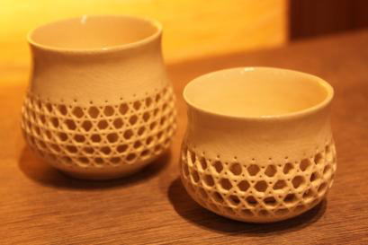 ![]() 透かし彫りのぐい呑み。このサイズでこの密度、彫りの精度は並で大抵はありません。(レシピはメンバーズサイトで 公開) |
