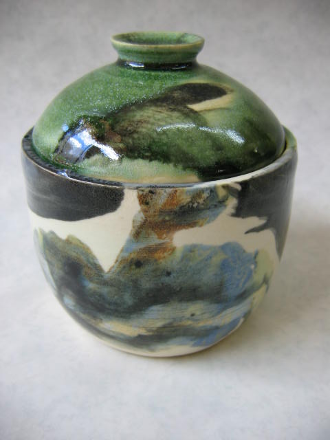 粗め土に自作の灰釉をベースに鉄分やマンガン等の釉薬を掛け合わせて制作した作品。電気窯での酸化焼成で、このように薪窯で焼成した風合いを再現したのは素晴らしいの一言です。講師としても嬉しいですね。 |