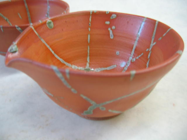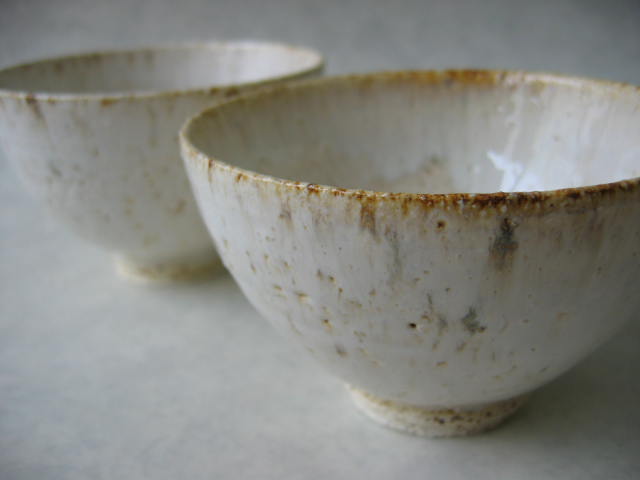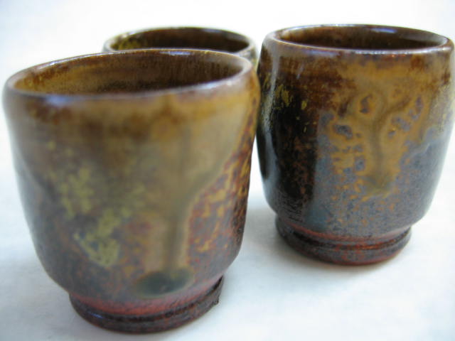 初めての紐積みで作った備前焼風の小鉢達。少々釉が流れすぎた感じがありますが、どれも初々しいですね。 |