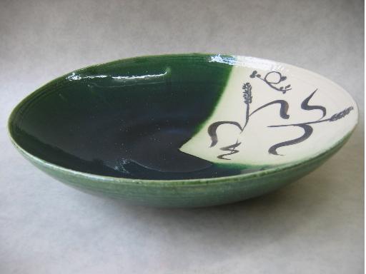 生地にムラ無く白泥を掛け緑釉で染めた作品。