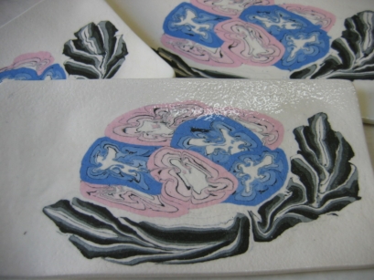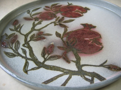 ![]() 練り込み紫陽花の組皿 図案化された紫陽花と葉が面白い。顔料の濃淡を上手に変化させモチーフを作っています。 |