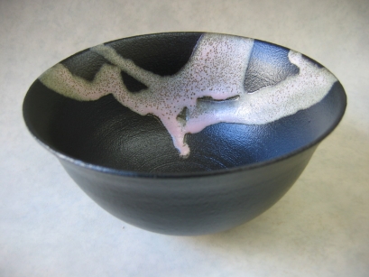 ![]() 夜桜の飯碗 黒釉をベースに桜釉を柄杓掛けしている。色彩のコントラストは夜桜を連想させますね。潔い釉調が素敵な逸品です。 |