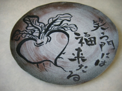 ![]() 笑う角には福来る 新年らしい呉須絵皿です、縁にかけられた黒系釉も格調高さを演出していますね。今年はきっといい年になりますね! |