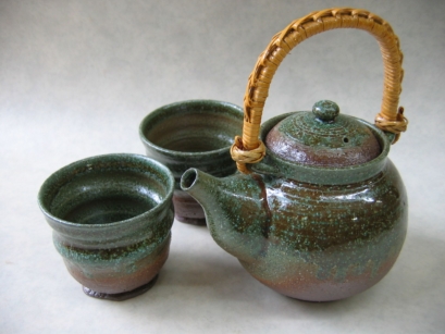 ![]() 焼酎サーバセット 銅系釉の還元焼成。強還元で焼成し銅の発色を窯変させている。真鋳のコックまで付いた完成度の高い逸品ですね。 |