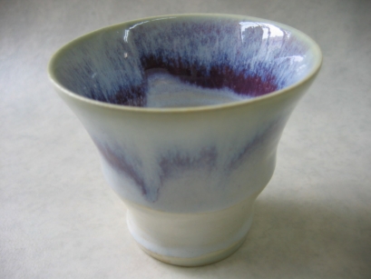 ![]() 白釉に紫釉をかけた作品 美しく垂れ下がった藤棚を思い浮かべる作品です。 |