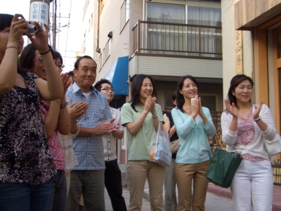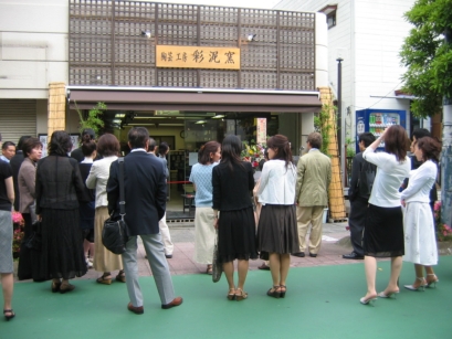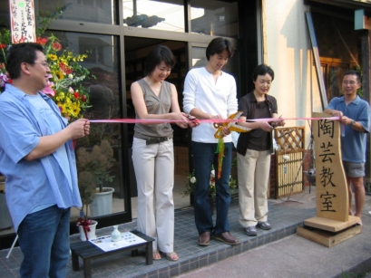 彩泥窯 新工房 開窯式典 行徳駅前教室 彩泥窯が行徳駅前に増床移転しました。彩冶、彩萌、彩芽、それぞれの代表者と主宰でテープカット。新工房を内覧し、チャーターバスでパーティ会場へ。 皆で手作りで作った工房。ここから新しい「彩泥窯陶芸」始まります。 2007年6月9日
