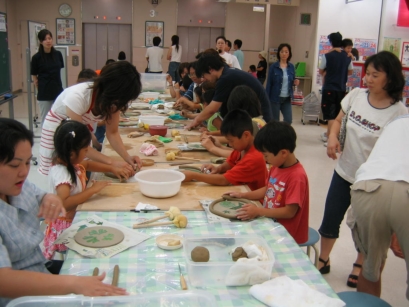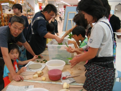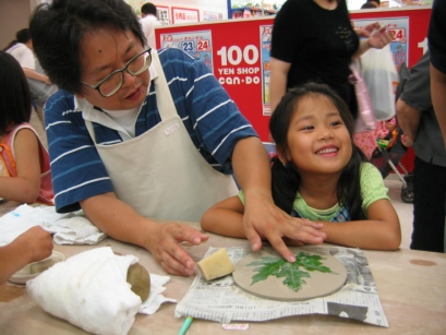 夏休み親子陶芸教室 【イベント版:イトーヨーカドー新浦安店】 2005年7月24日(日)イトーヨーカドー新浦安店の3階、特設会場にて彩泥窯の夏休み親子陶芸教室がイベントとして実施されました。当日は飛び入り参加も出るほどで、20組40名の親子の方々が和気あいあいと葉っぱのお皿作りにチャレンジされました。 2005年7月24日 ★★★イベント版親子陶芸教室の様子★★★