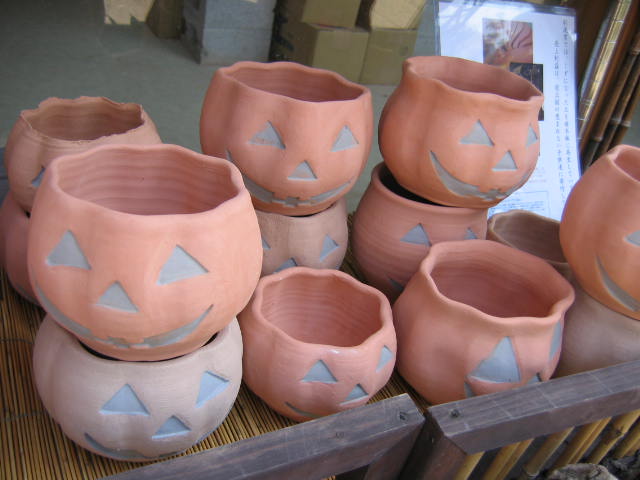 | ハロウィーン 彩泥窯では屑になった陶材料を廃棄せず、再生しています。再生した土でハロウィーンのカボチャ提灯や植木鉢を作りました。 これらは10月1日(金)13時から先着順で工房前にて販売します。 (売上利益はフォスタープランを通じて発展途上国の恵まれない子供達に寄付します) ★★★ハロウィーンのページへ★★★ 2004年10月1日13:00~販売開始 |