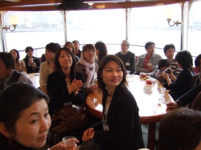 彩泥窯5周年記念クルージングパーティー 【開窯5年、豊かな作陶に感謝し開催。4月4日オカマの日に因んで少々おふざけも…】 2階が青空、開放的なゴキゲンな船、マルコポーロ号を貸切でチャーター。夕方出航、夕景色のお花見と夜景を満喫しました。混み合っている桜の下を川面から、超セレブなパーティーでした。