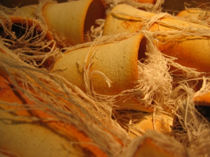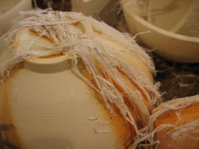 備前焼に代表される緋襷(ひだすき)という技法。運搬時に巻いた藁をとり忘れたのが発祥というエピソードを持つ技法。 焼成することにより、藁に含まれるアルカリ分が生地に転写し見事な緋色を発色させる。 ![]() |