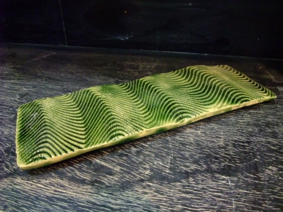 5月21日及びこの頃より芒種までの期間を小満といいます。「小満」とは「陽気盛んにして万物ようやく長じて満つる」の候という意味で、南の沖縄からはそろそろ梅雨入りが報じられます。暦の上で「夏」は「初夏」「仲夏」「晩夏」の三つに分けられますが、「小満」はそのうちの「初夏」の後半にあたります。さらにその「小満」の後半、第三候(6月1日~5日)あたりは熟した麦の穂が黄色く色づく頃で「麦の秋」、「麦秋(ばくしゅう)」と呼ばれ、俳句の季語としてもよく用いられます。今回は美しく色づいた広い麦畑を吹き渡る風をイメージした文様の器をつくってみました。特練りの赤土と、もぐさ土を2:1の割合で練り合わせ、たたらづくりで成形。この粘土の混合によって得られる色味と“ちりめん状”の表面に織部釉を施し、風吹き渡る麦秋を表現しました。 |