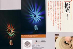 電動ろくろで成形、電動ドリル、ポンスなどでスリットを抜く。白色釉の施釉により、七色に変わるLEDライトの光と、スリットから漏れる光が美しく映る陶灯。光の変化と効果が面白い。 |