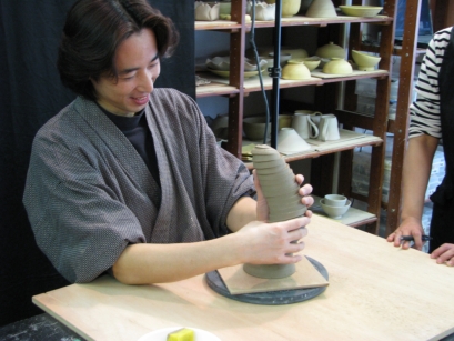 ロクロを回転させたまま筒状の生地を横に切っていくと、まるでバネのような形が出来あがる。つくってすぐは柔らかすぎるが1日ほど置いて半乾きにすると、しなやかな「土のバネ」となり、曲げて好きな形を作ることができる。この技法でできた形は、面白い灯りとなる。 |