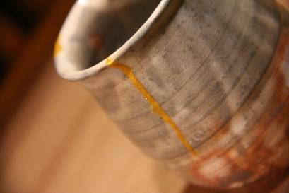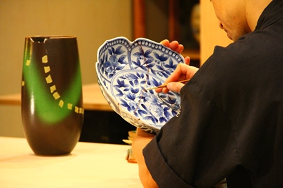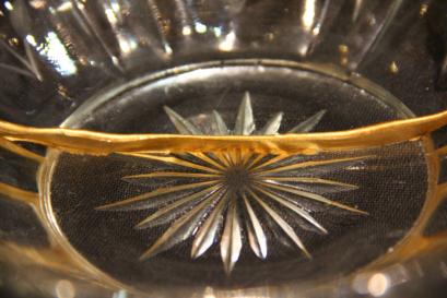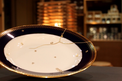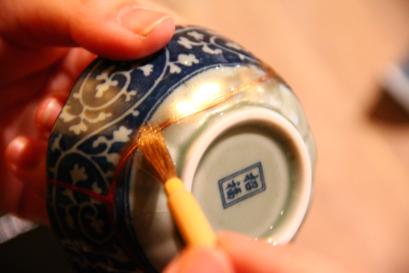 高額品や骨董品、など大切な器にお勧め 天然の漆を使って継ぎます。最後に金粉を蒔いて鯛の牙で磨き圧着、美しく仕上げます。 天然の漆を使いますので、漆かぶれの危険性があります。漆被れを回避するために、防具等を着用頂きますが、基本的にはスタッフが主に技術を実践します。 |